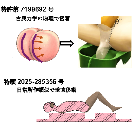 寝たきり状態における排泄は、本人の尊厳や健康に深く関わるだけでなく、介護者の負担や社会的コストにも直結する。特許第7199692号は、排便収納パウチ開口部と肛門との間に密着構造を形成して、排泄過程における便臭問題を大幅に改善した。 今回、特願2025-285356号により、省力かつ簡易な用具を用いて体位を垂直方向に移動させる新しい排泄支援方法を開発した。本技術の核心は、体位を垂直方向に移動させることで排泄物を即時に隔離する点にある。今後はこれを基盤として、想定されるモノ特許へと落とし込み、特許範囲の確立を図りたい。本技術の詳細については、機密保持のもとで開示し、必要に応じて先後願関係を踏まえた出願や共同出願についても相談可能である。